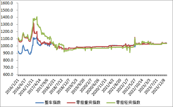 分車型看,各車型指數(shù)環(huán)比漲跌互現(xiàn)。其中,整車指數(shù)為1040.36點(diǎn),比上周回落0.09%;零擔(dān)輕貨指數(shù)為1033.73點(diǎn),比上周回升0.02%;零擔(dān)重貨指數(shù)為1039.36點(diǎn),比上周回落0.09%。