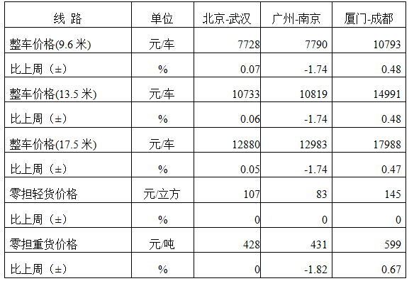 表1 本周部分線路平均價格及環(huán)比情況對比