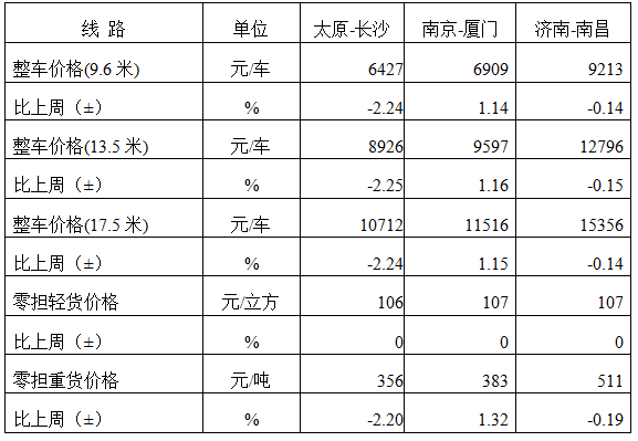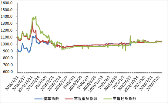 分車型看,各車型指數環比漲跌互現。其中,整車指數為1039.93點,比上周回落0.05%;零擔輕貨指數為1034.18點,比上周回升0.04%;零擔重貨指數為1038.93點,比上周回落0.05%。