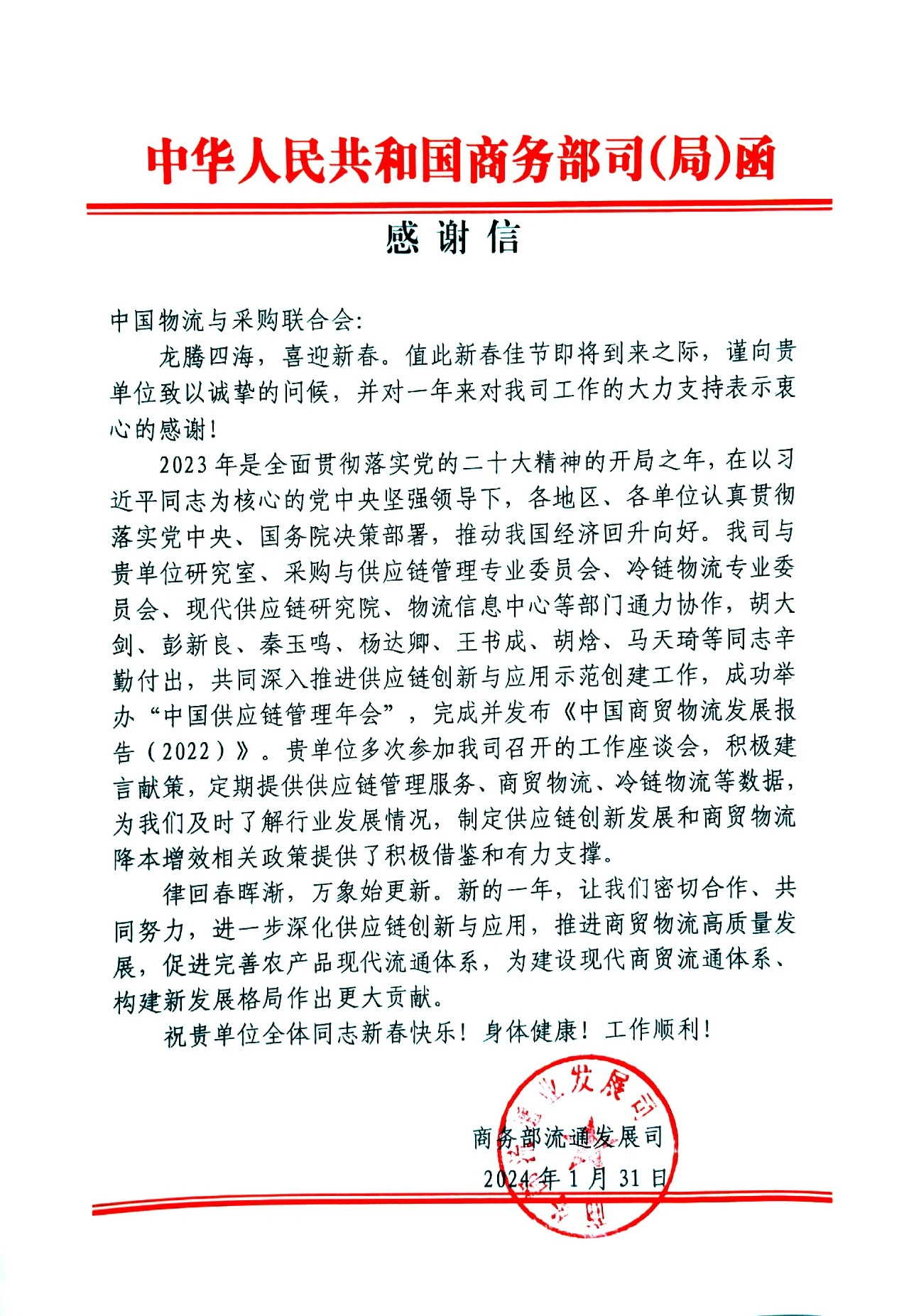 商務部流通發展司致信感謝中物聯