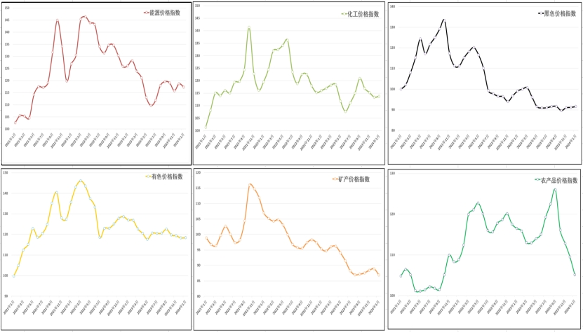 分行業看,化工、黑色和有色價格指數上漲,農產品、礦產和能源價格指數下跌。其中,化工價格指數止跌企穩,小幅回升至113.8,月環比上漲0.3%,年同比下跌1.9%;黑色價格指數連續三月上升,報91.6,月環比上漲0.4%,年同比下跌7.6%;有色價格指數低位徘徊,略有上漲,報118.4,月環比小幅上漲0.1%,年同比下跌6.7%;能源價格指數呈整蕩整理走勢,回落至117.4,月環比下跌1.2%,年同比下跌6.9%;礦產價格指數下挫,報2021年1月以來低點86.9,月環比下跌2.2%,年同比下跌8.8%;農產品價格指數再創新低,報105.2,為近24個月低點,月環比下跌4%,年同比下跌9.7%。