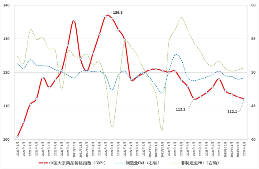 由中物聯大宗分會和上海鋼聯等單位聯合調查,中國物流與采購聯合會發布的2024年1月份中國大宗商品價格指數(CBPI)為112.1,環比小幅回落0.5%,同比下跌6.6%。從指數運行情況來看,臨近中國傳統春節假期,市場交投清淡,市場低位弱市運行,盡管受農產品價格下跌拖累,指數連續四月下跌,但跌幅逐漸收窄,顯示下行動力不足,特別是1月PMI指數小幅回升,也表明企業生產有恢復跡象,對后市我們仍保持原有觀點,預計市場價格下行空間有限。