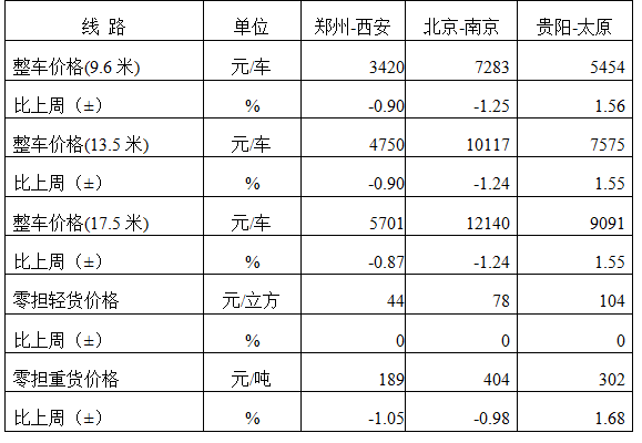 分車型看,各車型指數環比小幅回落。其中,整車指數為1026.91點,比上周回落0.02%;零擔輕貨指數為1020.83點,比上周回落0.01%;零擔重貨指數為1025.77點,比上周回落0.12%。