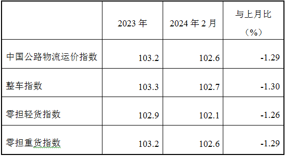 表1 2024年2月中國公路物流運價指數表