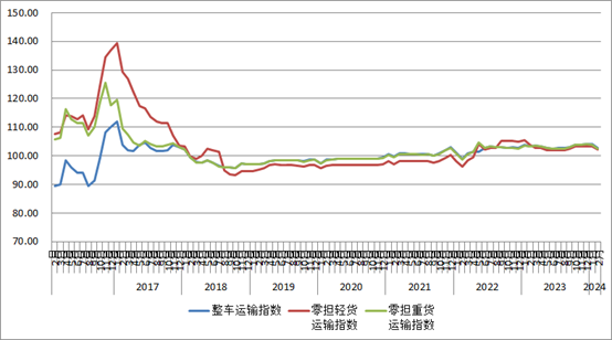 分車型指數看,各車型指數環比繼續回落,同比去年小幅下降。以大宗商品及區域運輸為主的整車指數為102.7點,比上月回落1.30%,比上年同期回落0.64%。零擔指數中,零擔輕貨指數為102.1點,比上月回落1.26%,比上年同期回落1.61%;零擔重貨指數為102.6點,比上月回落1.29%,比上年同期回落0.64%。