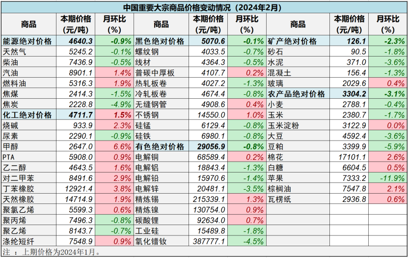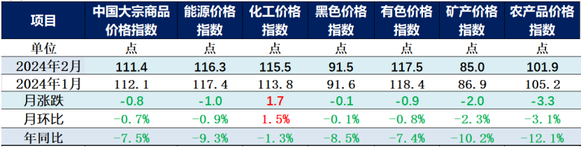 由中物聯(lián)大宗分會和上海鋼聯(lián)等單位聯(lián)合調(diào)查,中國物流與采購聯(lián)合會發(fā)布的2024年2月份中國大宗商品價格指數(shù)(CBPI)為111.4,環(huán)比小幅回落0.7%,同比下跌7.5%。從指數(shù)運行情況來看,受春節(jié)假期需求減弱因素影響,市場價格繼續(xù)維持低位運行態(tài)勢,但底部跡象明顯。隨兩會召開全年經(jīng)濟增長目標和經(jīng)濟政策逐步明朗,政府逆周期調(diào)節(jié)政策效果逐步顯現(xiàn),以及節(jié)后企業(yè)生產(chǎn)活動日趨活躍,預(yù)計市場價格下行空間有限、經(jīng)濟回升向好態(tài)勢將進一步鞏固。