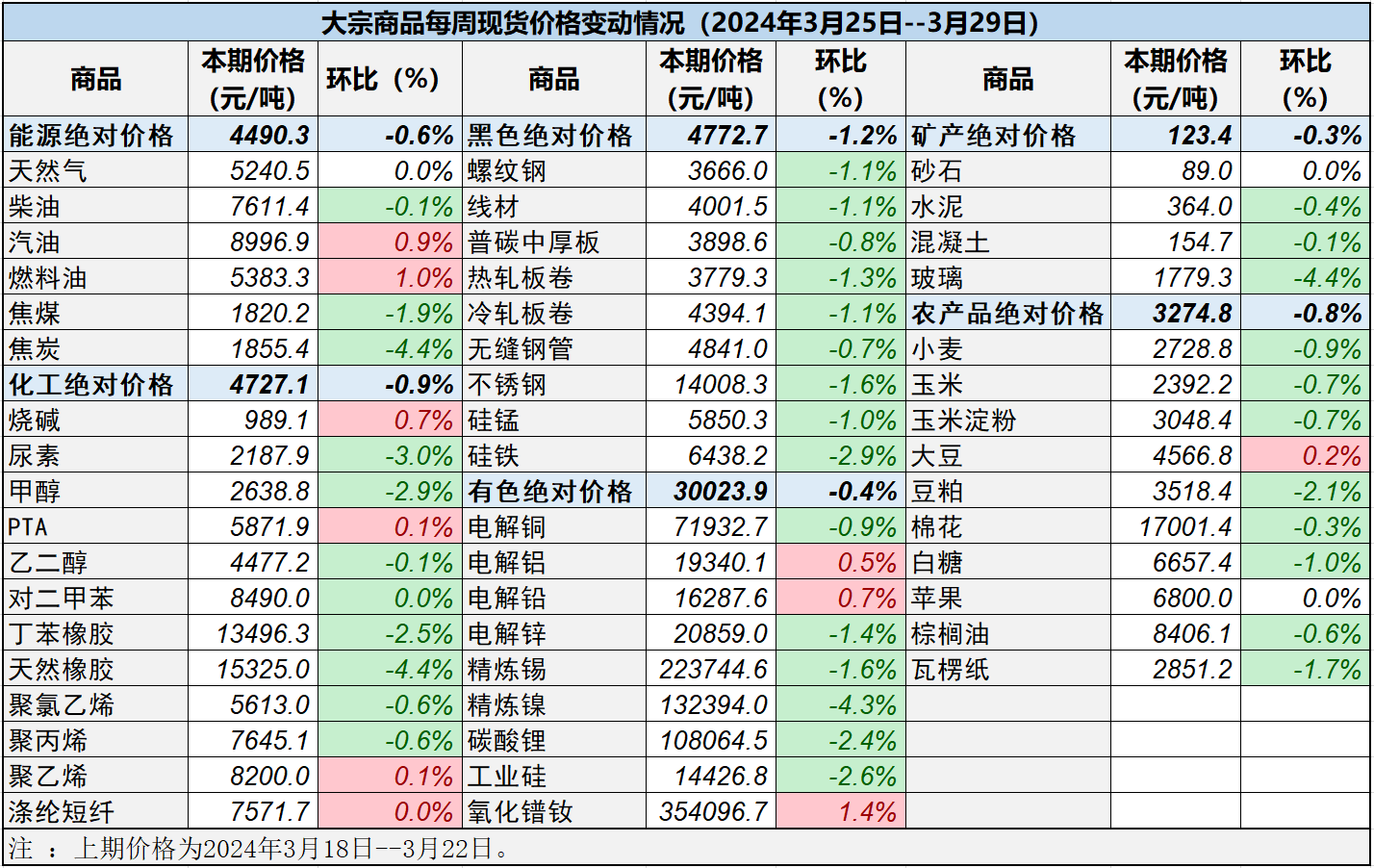 本表所示大宗商品價(jià)格(類別與產(chǎn)品規(guī)格說明見附表)為以人民幣計(jì)價(jià)的現(xiàn)貨價(jià)格(包含流通費(fèi)用、利潤和稅費(fèi)等)。計(jì)算這些價(jià)格時(shí)使用的信息來源,主要包括國內(nèi)重點(diǎn)地區(qū)的生產(chǎn)商、貿(mào)易商及下游消費(fèi)企業(yè)之間的成交、詢報(bào)盤及可成交價(jià)格。價(jià)格單位為人民幣元/噸。