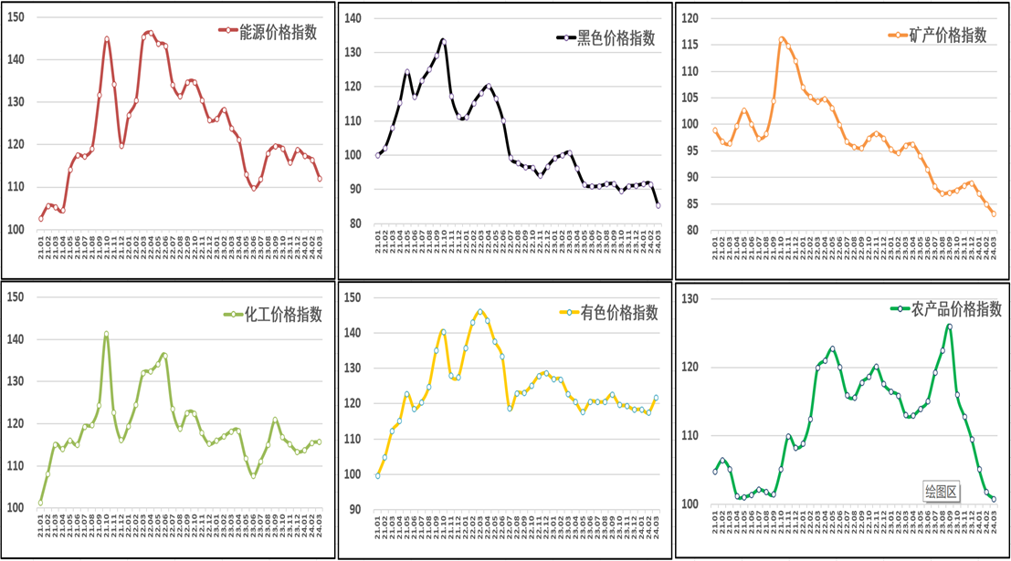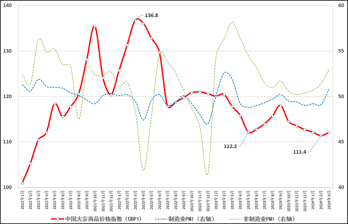 由中物聯(lián)大宗分會(huì)和上海鋼聯(lián)等單位聯(lián)合調(diào)查,中國(guó)物流與采購(gòu)聯(lián)合會(huì)發(fā)布的2024年3月份中國(guó)大宗商品價(jià)格指數(shù)(CBPI)為112,環(huán)比小幅上升0.6%,同比下跌4.9%。從指數(shù)運(yùn)行情況來(lái)看,3月份CBPI自低位小幅回升,表明隨各項(xiàng)穩(wěn)經(jīng)濟(jì)政策持續(xù)發(fā)力,市場(chǎng)信心有所恢復(fù)、下游消費(fèi)逐步回暖、經(jīng)濟(jì)運(yùn)行呈現(xiàn)恢復(fù)向好態(tài)勢(shì)。雖然當(dāng)前仍面臨國(guó)際形勢(shì)復(fù)雜多變、市場(chǎng)需求疲弱、生產(chǎn)規(guī)模減少等不利因素,但結(jié)合各分項(xiàng)指數(shù)表現(xiàn)來(lái)看,市場(chǎng)整體正處于筑底過(guò)程。