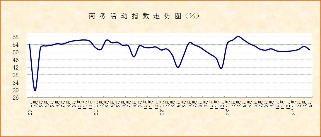 中國物流與采購聯合會、國家統計局服務業調查中心發布的2024年4月份中國非制造業商務活動指數較上月下降1.8個百分點,結束連續4個月上升走勢,但仍在51.2%,顯示非制造業經營活動在上月快速啟動后,增速有所放緩,但仍保持平穩適度增長。以批發業和銀行業為代表的生產性相關服務業在3月企業采購需求和資金需求集中釋放后,經營活動增速有所回調,是導致非制造業整體增速放緩的主要因素,上述行業的商務活動指數較上月均有不同程度下降。