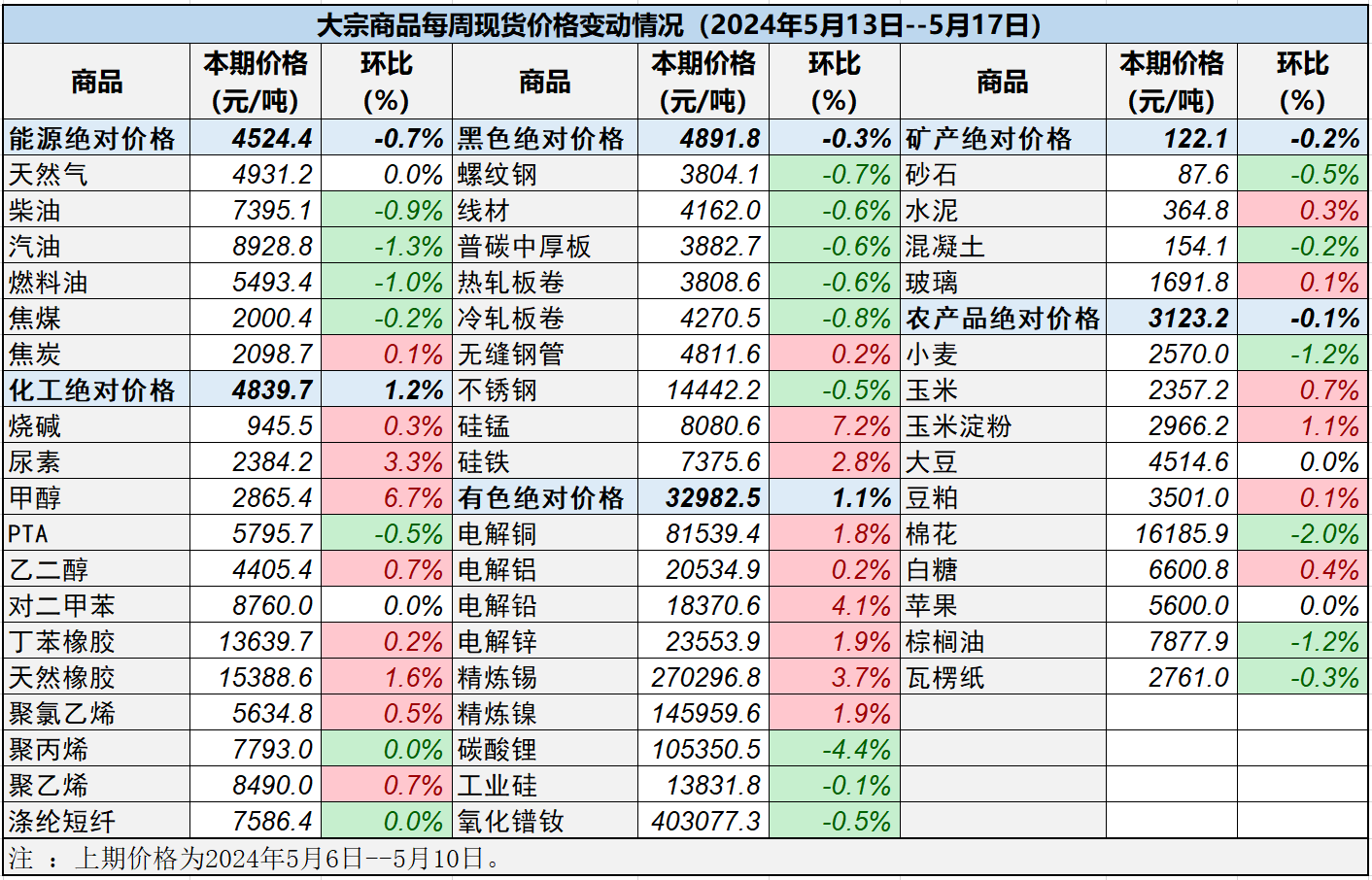 本表所示大宗商品價格(類別與產品規格說明見附表)為以人民幣計價的現貨價格(包含流通費用、利潤和稅費等)。計算這些價格時使用的信息來源,主要包括國內重點地區的生產商、貿易商及下游消費企業之間的成交、詢報盤及可成交價格。價格單位為人民幣元/噸。