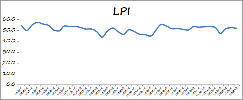 中國物流與采購聯合會發布的2024年5月份中國物流業景氣指數為51.8%,環比回落0.6個百分點。分項指數中業務總量指數、庫存周轉次數指數、資金周轉率指數、固定資產投資完成額指數、業務活動預期指數等關鍵指標均處于景氣區間,同時固定資產投資完成額指數、從業人員指數和業務活動預期指數呈連續回升態勢。
