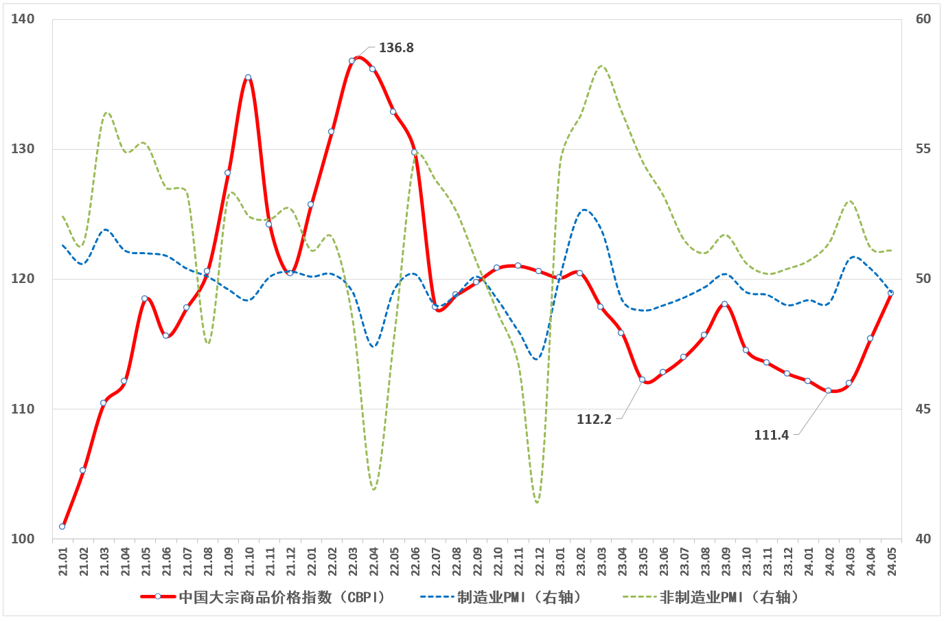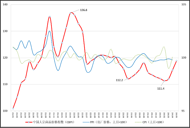 由中物聯大宗分會和上海鋼聯等單位聯合調查,中國物流與采購聯合會發布的2024年5月份中國大宗商品價格指數(CBPI)為118.9點,環比上升3%,同比上漲5.9%。從指數運行情況來看,5月份CBPI連續第三個月上漲,創近15個月新高,且價格環比上漲行業數量從4月份的21個擴張至30個,表明隨宏觀組合政策效應逐步顯現,企業生產持續恢復,行業景氣度回升、國內經濟穩中向好態勢進一步鞏固。但從國內外大宗商品價格指數走勢來看,外需有回落放緩跡象,內需仍相對不足,此外制造業增速回落,以及流通效率低、成本高等問題仍然突出,部分大宗行業面臨回調壓力加大,經濟增長內生動力仍有待提升和加強。