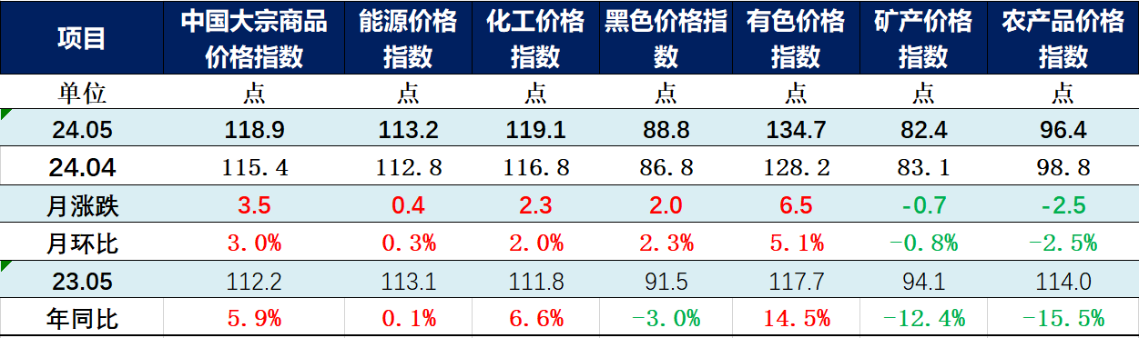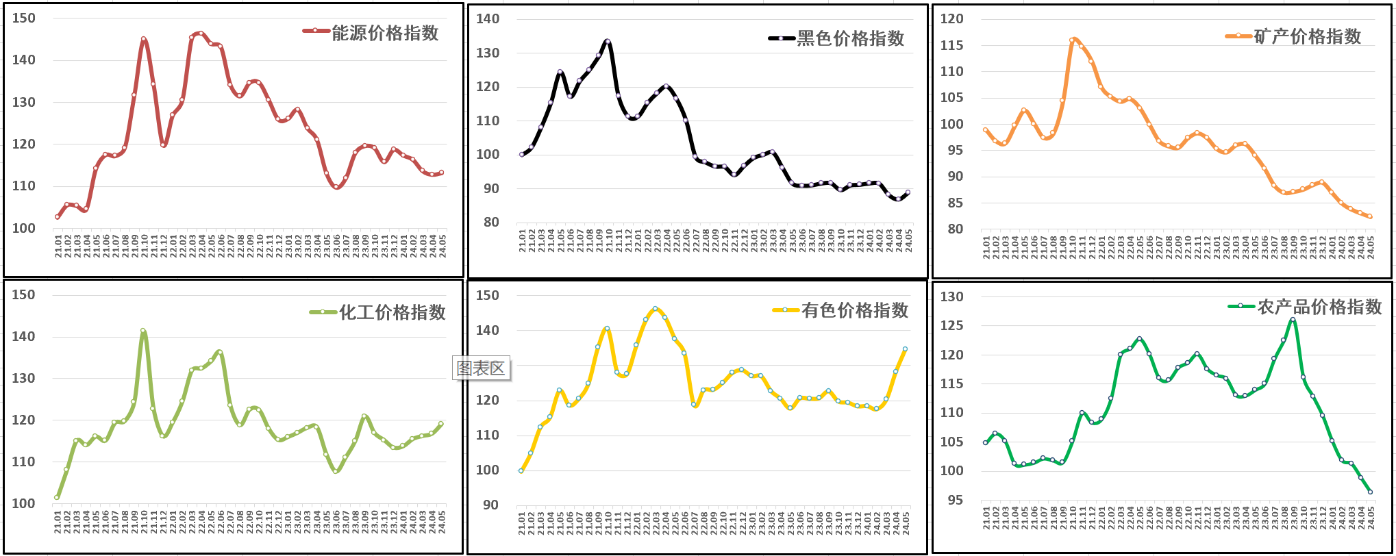 分行業看:有色、黑色、化工、能源價格指數環比上漲,農產品和礦產品指數下跌。其中,有色價格指數連漲三月,創近24個月新高,報134.7點,月環比上漲5.1%,年同比上漲14.5%;黑色價格指數低位反彈,報88.8點,月環比上漲2.3%,年同比下跌3%;化工價格指數連漲五月,創年內新高,報119.1點,月環比上漲2%,年同比上漲6.6%;能源價格指數小幅上漲,報113.2點,月環比上漲0.3%,年同比上漲0.1%;礦產價格指數跌幅收窄,報82.4點,月環比下跌0.8%,年同比下跌12.4%;農產品價格指數繼續走低,報96.4點,月環比下跌2.5%,年同比下跌15.5%。