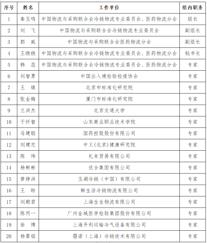 國際標準化組織冷鏈物流技術委員會(ISO/TC 315)國內技術對口工作組專家名單如下: