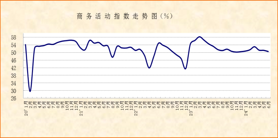 中國物流與采購聯(lián)合會、國家統(tǒng)計(jì)局服務(wù)業(yè)調(diào)查中心發(fā)布的2024年6月份中國非制造業(yè)商務(wù)活動指數(shù)為50.5%,較上月下降0.6個(gè)百分點(diǎn),但仍在50%以上,意味著非制造業(yè)經(jīng)營活動仍保持?jǐn)U張態(tài)勢,但增速較上月有所放緩。分行業(yè)看,建筑業(yè)和服務(wù)業(yè)的商務(wù)活動指數(shù)較上月均有不同程度下降,但均在50%以上。繼上月五一假期需求集中釋放后,接觸型消費(fèi)相關(guān)服務(wù)業(yè)活動在高基數(shù)基礎(chǔ)上有所回落,是導(dǎo)致非制造業(yè)增速放緩的主要因素。零售業(yè)、住宿業(yè)、餐飲業(yè)和文體娛樂相關(guān)行業(yè)的商務(wù)活動指數(shù)較上月均有不同程度下降。基建投資相關(guān)行業(yè)、貨幣金融服務(wù)業(yè)與信息服務(wù)相關(guān)行業(yè)表現(xiàn)良好,成為6月非制造業(yè)經(jīng)營活動保持?jǐn)U張的主要支撐力量。