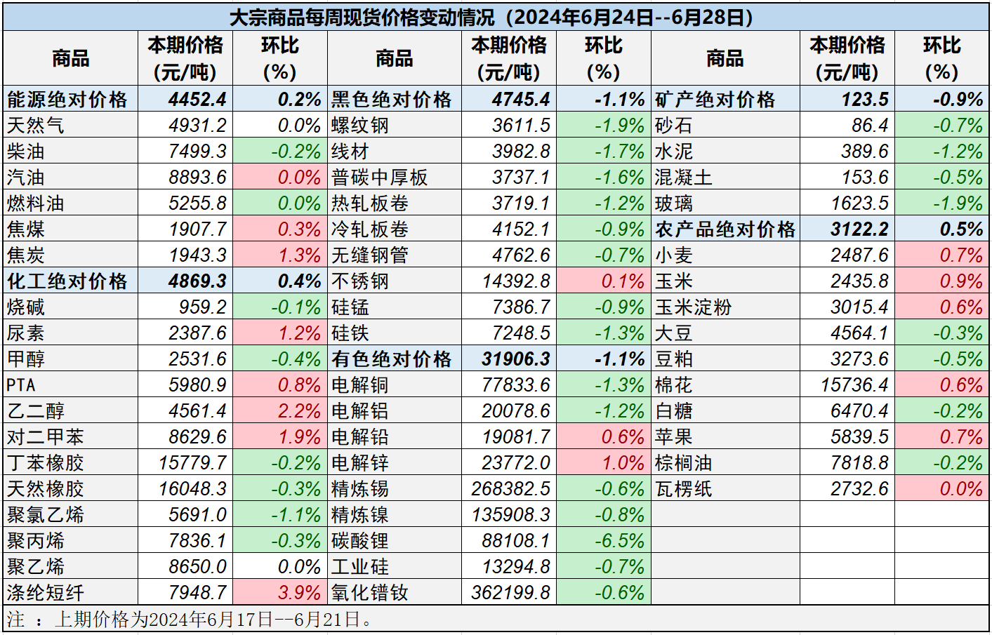 據(jù)中國物流與采購聯(lián)合會對全國50種重要大宗商品市場價格調(diào)查顯示,本期價格(2024年6月24日至6月28日)與上期價格相比,31種(占比62%)大宗商品價格下跌,17種(占比34%)價格上漲,2種(占比4%)價格持平。
