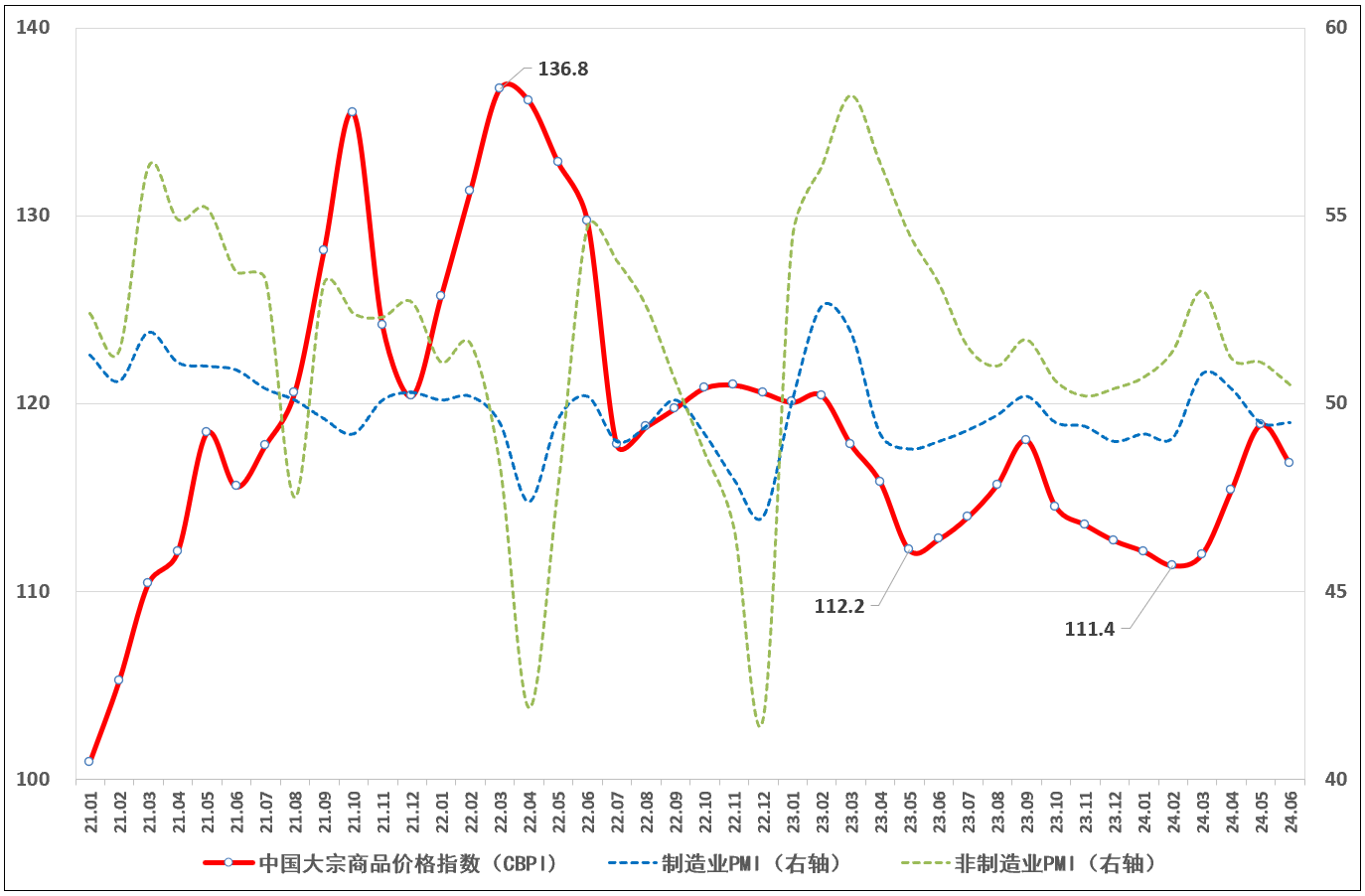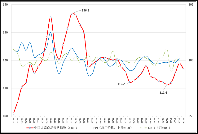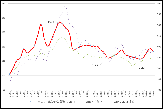 由中物聯大宗分會和上海鋼聯等單位聯合調查,中國物流與采購聯合會發布的2024年6月份中國大宗商品價格指數(CBPI)為116.8點,環比回落1.7%,同比上漲3.6%。從指數運行情況來看,6月份CBPI因進入高溫多雨季節等因素影響而有所回落,但仍處于年內高位,表明隨系列宏觀政策持續靠前發力,大宗市場景氣水平和企業生產經營活動基本穩定,總體保持擴張,但增速有所放緩。從國內外大宗商品價格指數走勢來看,國內外市場需求偏弱仍是當前面臨的主要問題,當前我國大宗市場正處于蓄力回升的關鍵階段,增強經濟增長內生動力,仍需加大宏觀政策調節力度,進一步發揮流通業在穩增長、降成本和促消費中的重要作用,著力打通制約經濟循環的卡點堵點。
