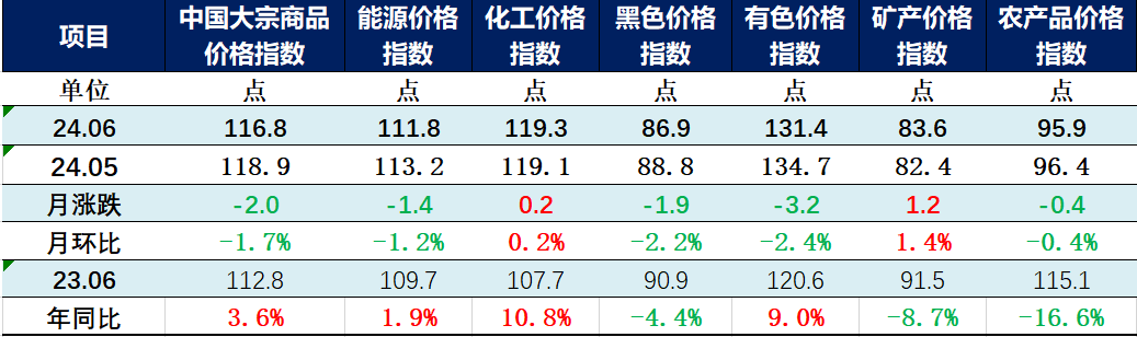分行業看:有色、黑色、能源和農產品指數下跌,礦產品、化工價格指數環比上漲。其中,有色價格指數自高點回落,報131.4點,月環比下跌2.4%,年同比上漲9%;黑色價格指數小幅下行,報86.9點,月環比下跌2.2%,年同比下跌4.4%;能源價格指數再度下探,創近11個月以來低點,報111.8點,月環比下跌1.2%,年同比上漲1.9%;農產品價格指數延續跌勢,但跌幅收窄,報95.9點,月環比下跌0.4%,年同比下跌16.6%;化工價格指數再創年內新高,但漲幅收窄,報119.3點,月環比上漲0.2%,年同比上漲10.8%;礦產價格指數自低點反彈,報83.6點,月環比上漲1.4%,年同比下跌8.7%。