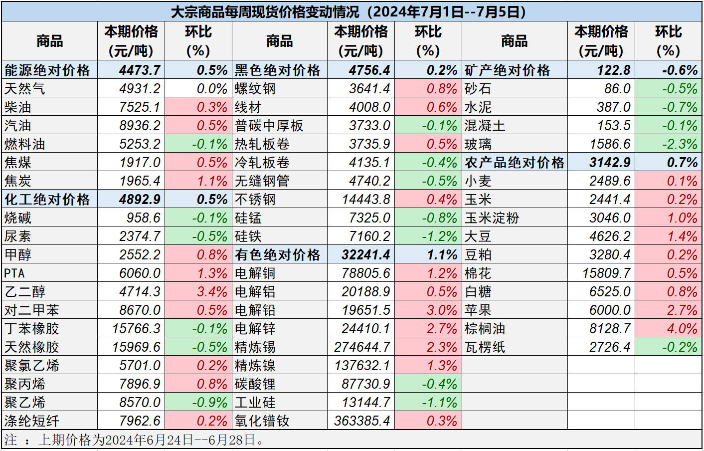 本表所示大宗商品價格(類別與產品規格說明見附表)為以人民幣計價的現貨價格(包含流通費用、利潤和稅費等)。計算這些價格時使用的信息來源,主要包括國內重點地區的生產商、貿易商及下游消費企業之間的成交、詢報盤及可成交價格。價格單位為人民幣元/噸。