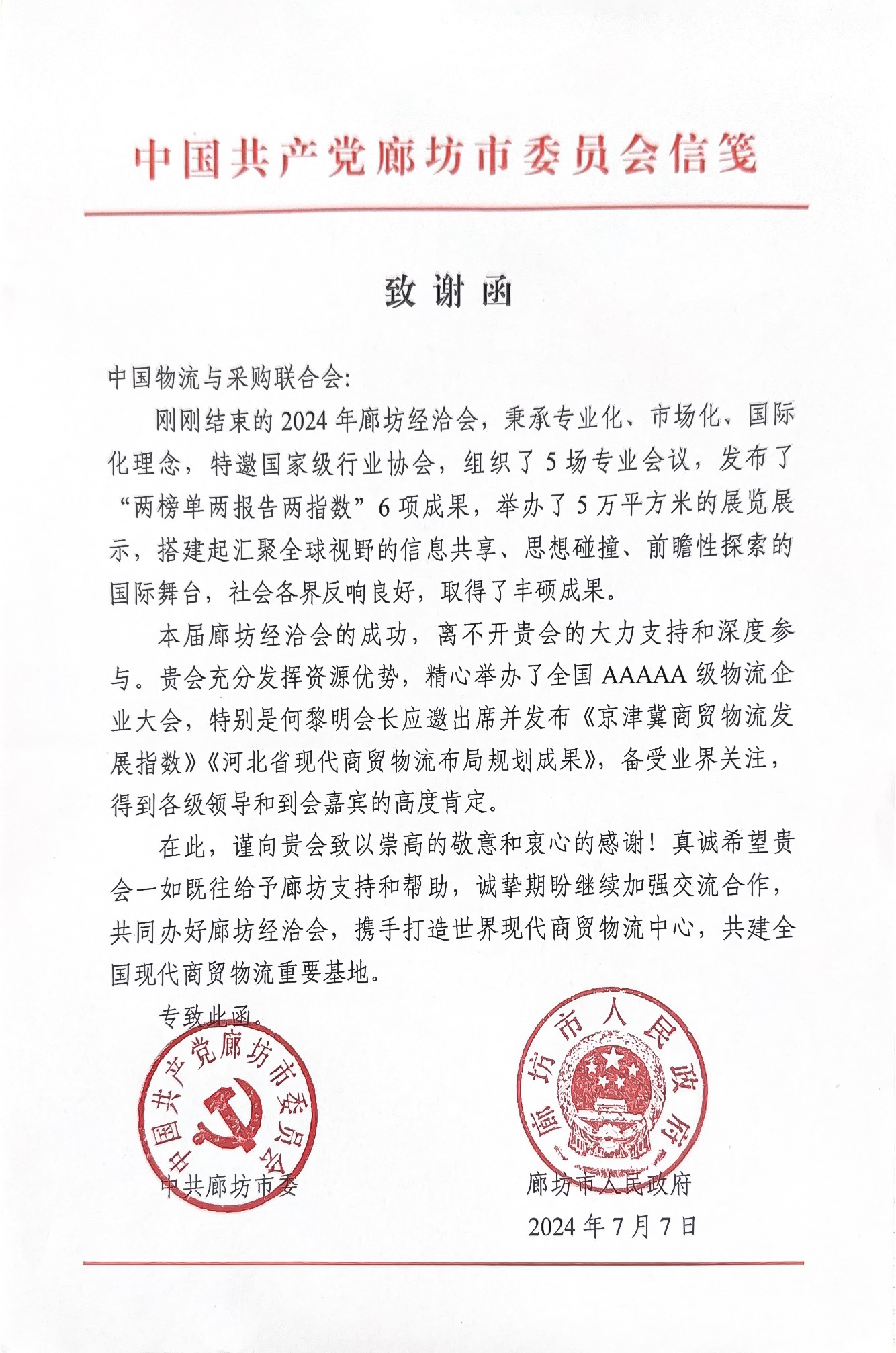 中共廊坊市委、市政府致信感謝中物聯(lián)