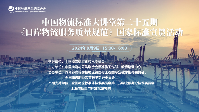 2024年8月9日,“中國物流標準大講堂”第25期活動通過線上方式對《口岸物流服務質量規范》國家標準進行了宣貫。行業企業代表、專家、院校學生共1800人次參加了宣貫活動。