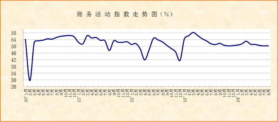 暑期消費和線上消費相關活動持續向好運行。8月,服務業商務活動指數為50.2%,較上月上升0.2個百分點,意味著服務業活動保持擴張。細分行業數據顯示,暑期消費和線上消費相關行業保持活躍,為服務業保持擴張提供了支撐。