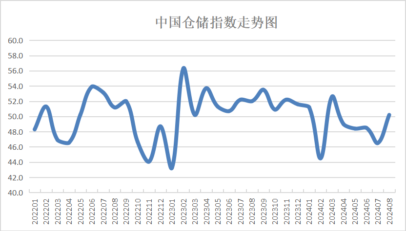中國物流與采購聯合會和中儲發展股份有限公司聯合調查的中國倉儲指數,2024年8月份為50.2%,較上月回升3.7個百分點,結束連續四個月的下行走勢,重回擴張區間。期末庫存、平均庫存周轉次數、企業員工、業務活動預期等主要指數均有不同程度回升,顯示商品周轉效率加快,上下游運輸銜接順暢,企業預期向好,備貨積極性提高,行業運行壓力得到緩解。但新訂單指數仍位于收縮區間,顯示倉儲業務需求仍有不足。具體來看,本月指數有以下幾個特點: