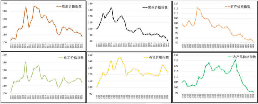 分行業(yè)看:黑色價(jià)格指數(shù)延續(xù)跌勢,報(bào)79.4點(diǎn),月環(huán)比下跌5.9%,年同比下跌13.3%;有色價(jià)格指數(shù)回吐漲幅,報(bào)122.6點(diǎn),月環(huán)比下跌3.8%,年同比上漲1.6%;化工價(jià)格指數(shù)繼續(xù)回調(diào),報(bào)114.4點(diǎn),月環(huán)比下跌3.4%,年同比下跌0.5%;能源價(jià)格指數(shù)跌幅擴(kuò)大,報(bào)107.7點(diǎn),月環(huán)比下跌3.6%,年同比下跌8.7%;礦產(chǎn)價(jià)格指數(shù)震蕩下行,報(bào)80.7點(diǎn),月環(huán)比下跌2.4%,年同比下跌7.3%;農(nóng)產(chǎn)品價(jià)格指數(shù)低位震蕩,報(bào)95.7點(diǎn),月環(huán)比下跌0.7%,年同比下跌21.9%。