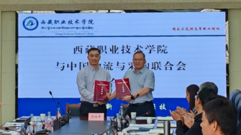 西藏職業技術學院黨委副書記、校長陳飛與中物聯教育培訓部主任李俊峰簽合作協議