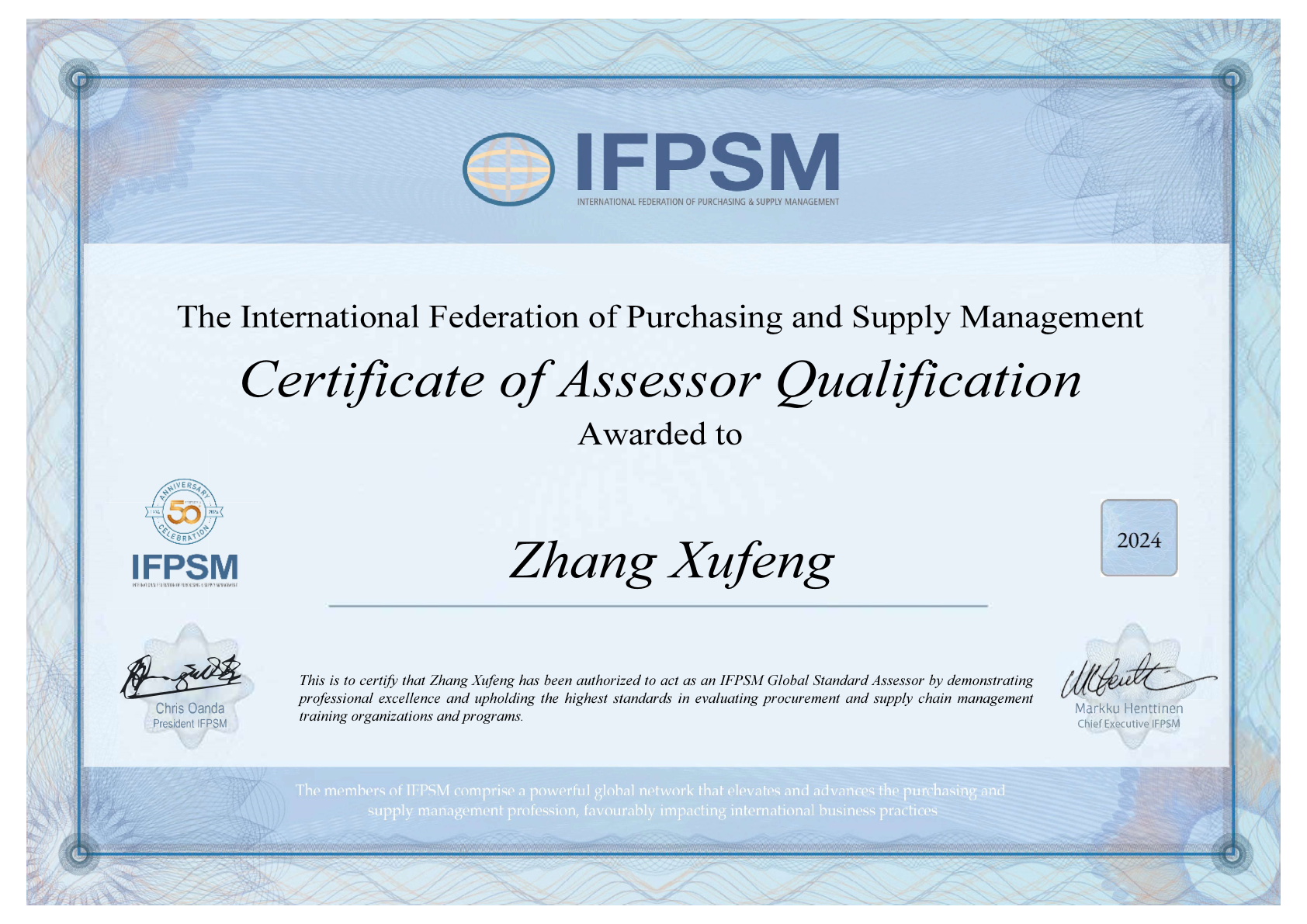 2021年,中國物流與采購聯合會首次向IFPSM推薦張旭鳳擔任全球標準認證項目的評審專家,經IFPSM董事會資格審查和培訓,張旭鳳成為IFPSM首位中國評審專家。之后張旭鳳在聘期內承擔了多個IFPSM GS認證項目的評審,相關工作得到IFPSM的高度認可。