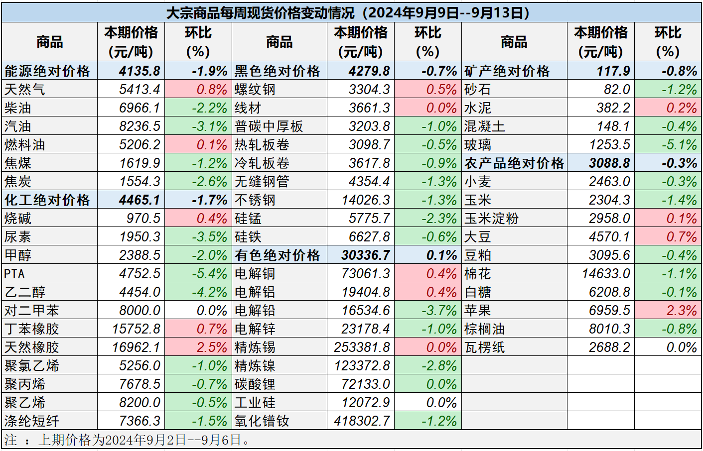 本表所示大宗商品價格(類別與產品規格說明見附表)為以人民幣計價的現貨價格(包含流通費用、利潤和稅費等)。計算這些價格時使用的信息來源,主要包括國內重點地區的生產商、貿易商及下游消費企業之間的成交、詢報盤及可成交價格。價格單位為人民幣元/噸。