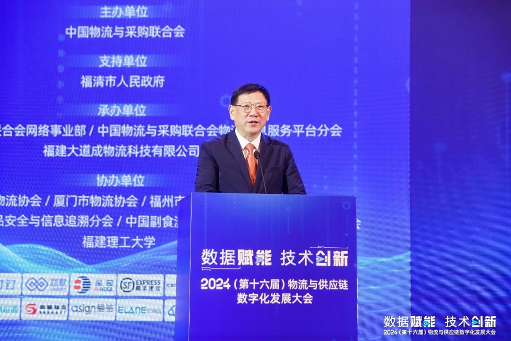 9月27日,由中國物流與采購聯合會主辦,中國物流與采購聯合會網絡事業部、中國物流與采購聯合會物流信息服務平臺分會、福建大道成物流科技有限公司承辦的2024(第十六屆)物流與供應鏈數字化發展大會在福清舉行。會議以“數據賦能 技術創新”為主題,聚焦物流與供應鏈數字化轉型,面向制造、貿易、物流、供應鏈等企業展示前沿技術、解決方案等,推廣先進經驗和典型案例,推進數字技術賦能物流與供應鏈上下游企業,引領全產業鏈高效發展。中國物流與采購聯合會副會長兼秘書長崔忠付,國家市場監督管理總局發展研究中心副主任葉寶文,福清市委副書記、福清市人民政府市長吳永忠出席大會,來自全國各地的政府官員、企業家、地方行業組織、科研機構、專家學者以及媒體記者等800余人參加大會。會議上半場由中國物流與采購聯合會網絡事業部主任、物流信息服務平臺分會秘書長晏慶華主持。