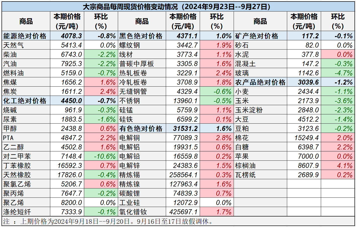 本表所示大宗商品價格(類別與產品規格說明見附表)為以人民幣計價的現貨價格(包含流通費用、利潤和稅費等)。計算這些價格時使用的信息來源,主要包括國內重點地區的生產商、貿易商及下游消費企業之間的成交、詢報盤及可成交價格。價格單位為人民幣元/噸。