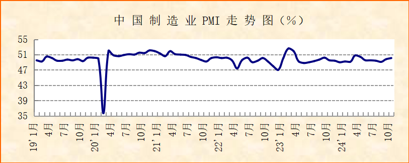 中國(guó)物流與采購(gòu)聯(lián)合會(huì)、國(guó)家統(tǒng)計(jì)局服務(wù)業(yè)調(diào)查中心發(fā)布的2024年10月份中國(guó)制造業(yè)采購(gòu)經(jīng)理指數(shù)(PMI)為50.1%,較上月上升0.3個(gè)百分點(diǎn),連續(xù)2個(gè)月上升,且在連續(xù)5個(gè)月運(yùn)行在50%以下后回到景氣區(qū)間。分項(xiàng)指數(shù)普遍上升,顯示當(dāng)前經(jīng)濟(jì)運(yùn)行積極變化明顯,市場(chǎng)需求改善,生產(chǎn)加快,上下游市場(chǎng)價(jià)格聯(lián)動(dòng)回升,基礎(chǔ)原材料行業(yè)止降回穩(wěn),新動(dòng)能保持平穩(wěn)增長(zhǎng),企業(yè)預(yù)期樂(lè)觀,經(jīng)濟(jì)向好回升基礎(chǔ)繼續(xù)鞏固。