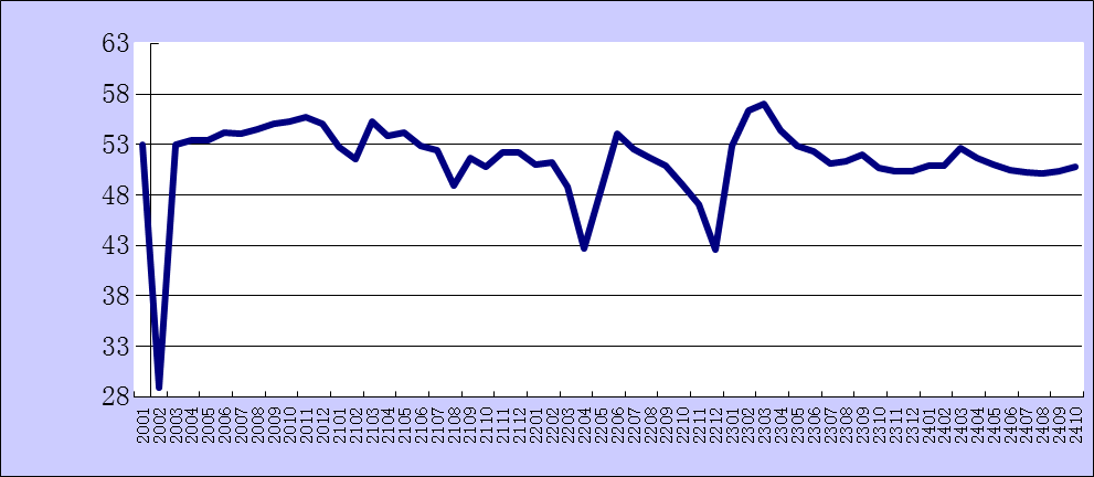 2020年1月-2024年10月綜合PMI產出指數走勢圖