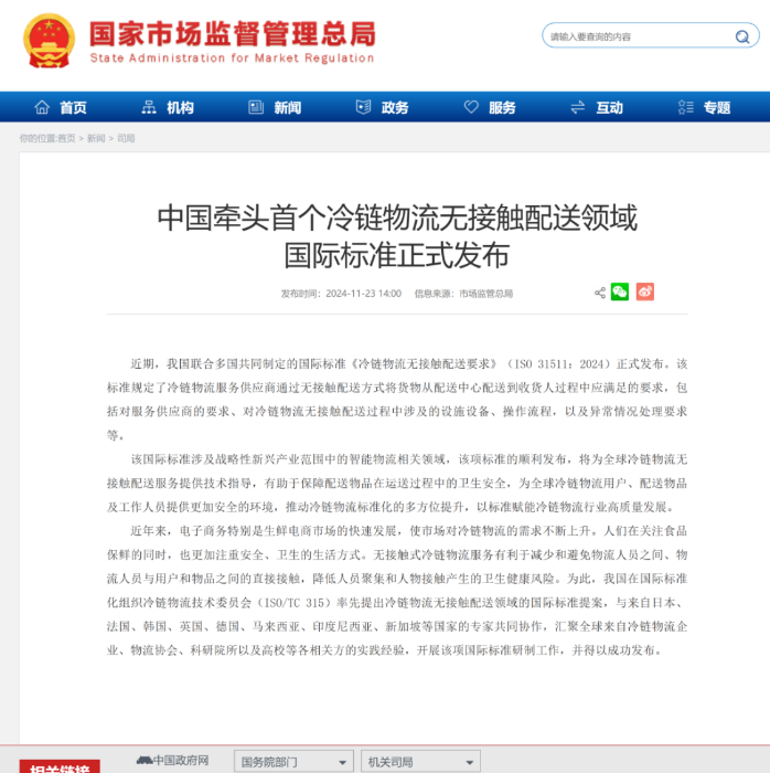 2024年11月,《冷鏈物流無接觸配送要求》(ISO 31511:2024)國際標準正式發(fā)布,這是由中國提出的在冷鏈物流領(lǐng)域發(fā)布的首個國際標準。該標準提案是由中國物流與采購聯(lián)合會組織中國標準化研究院等單位在國際標準化組織冷鏈物流技術(shù)委員會(ISO/TC 315)率先提出。