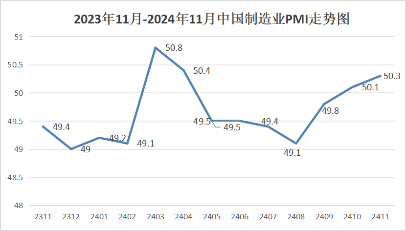中國物流與采購聯(lián)合會、國家統(tǒng)計局服務(wù)業(yè)調(diào)查中心發(fā)布的2024年11月份中國制造業(yè)采購經(jīng)理指數(shù)(PMI)為50.3%,比上月上升0.2個百分點。