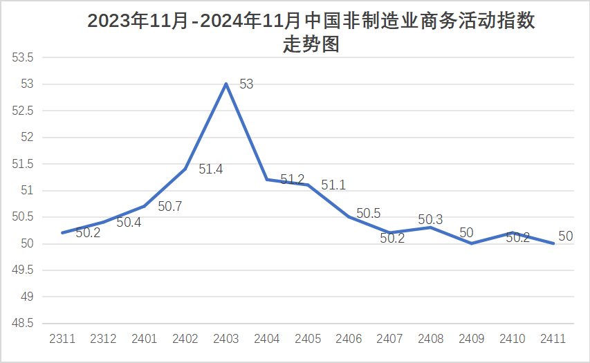 中國物流與采購聯合會、國家統計局服務業調查中心發布的2024年11月份中國非制造業商務活動指數為50%,環比下降0.2個百分點。由于非制造業沒有綜合指數,通常以商務活動指數來反映非制造業經濟的總體變化。