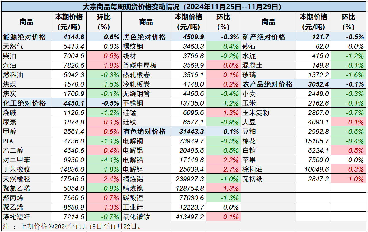 據中國物流與采購聯合會對全國50種重要大宗商品市場價格調查顯示,本期價格(2024年11月25日至11月29日)與上期價格相比,26種(占比52%)大宗商品價格下跌,20種(占比40%)價格上漲,4種(占比8%)價格持平。