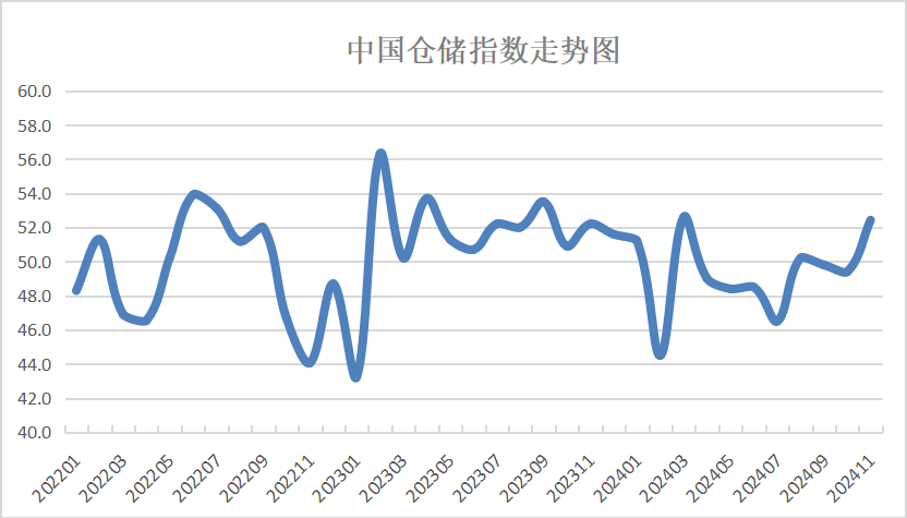 中國物流與采購聯合會和中儲發展股份有限公司聯合調查的中國倉儲指數,2024年11月份為52.4%,較上月回升3個百分點,時隔兩個月重回擴張區間。新訂單、設施利用率、期末庫存、平均庫存周轉次數、業務活動預期等主要分項指數均有不同程度回升,顯示倉儲業務需求顯著回升,商品周轉保持活躍,企業補庫積極性有所提高,庫存水平企穩上升,倉儲行業前期下行壓力得到明顯緩解,行業運行企穩向好。具體來看,本月指數有以下幾個特點: