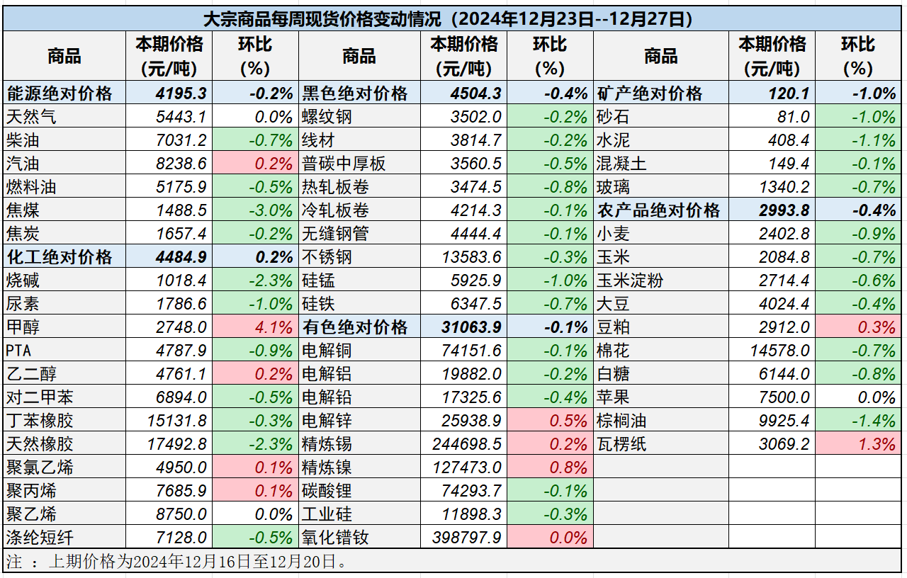 據(jù)中國物流與采購聯(lián)合會對全國50種重要大宗商品市場價(jià)格調(diào)查顯示,本期價(jià)格(2024年12月23日至12月27日)與上期價(jià)格相比,36種(占比72%)大宗商品價(jià)格下跌,11種(占比22%)價(jià)格上漲,3種(占比6%)價(jià)格持平。