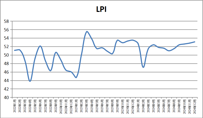 中國物流與采購聯合會發布的2024年12月份中國物流業景氣指數為53.1%,環比上升0.3個百分點。數據顯示,12月份物流景氣指數為本年度新高,物流活躍度繼續增強。主要指標中,業務總量指數、新訂單指數、庫存周轉次數指數、資金周轉率指數、設備利用率指數、固定資產投資完成額指數、從業人員指數、業務活動預期指數處在擴張區間,全年實現順利收官。