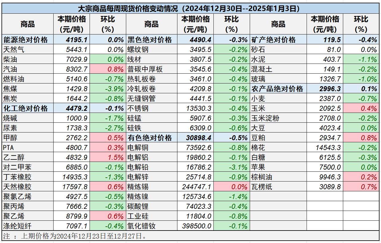 據(jù)中國物流與采購聯(lián)合會對全國50種重要大宗商品市場價格調(diào)查顯示,本期價格(2024年12月30日至2025年1月3日)與上期價格相比,37種(占比74%)大宗商品價格下跌,11種(占比22%)價格上漲,2種(占比4%)價格持平。