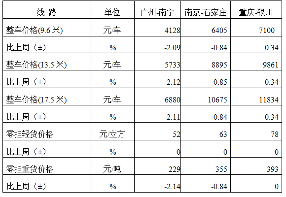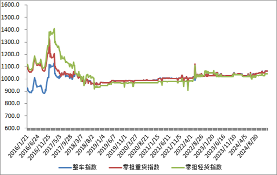 分車型看,各車型指數環比略有增長。其中,整車指數為1064.09點,比上周回升0.03%;零擔輕貨指數為1041.12點,與上周基本持平;零擔重貨指數為1063.78點,比上周回升0.02%。