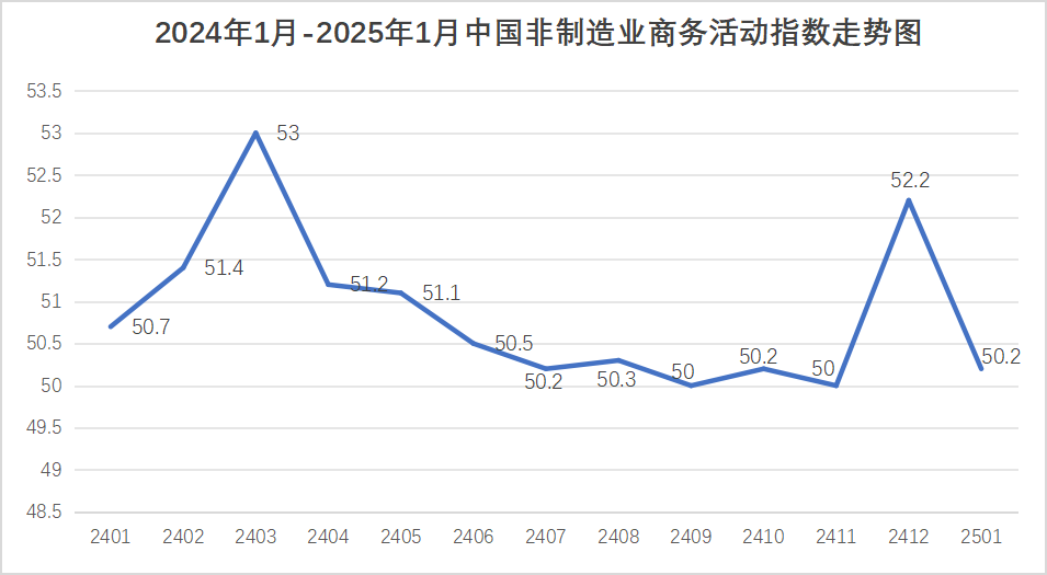 中國物流與采購聯合會、國家統計局服務業調查中心發布的2025年1月份中國非制造業商務活動指數為50.2%,環比下降2個百分點。由于非制造業沒有綜合指數,通常以商務活動指數來反映非制造業經濟的總體變化。