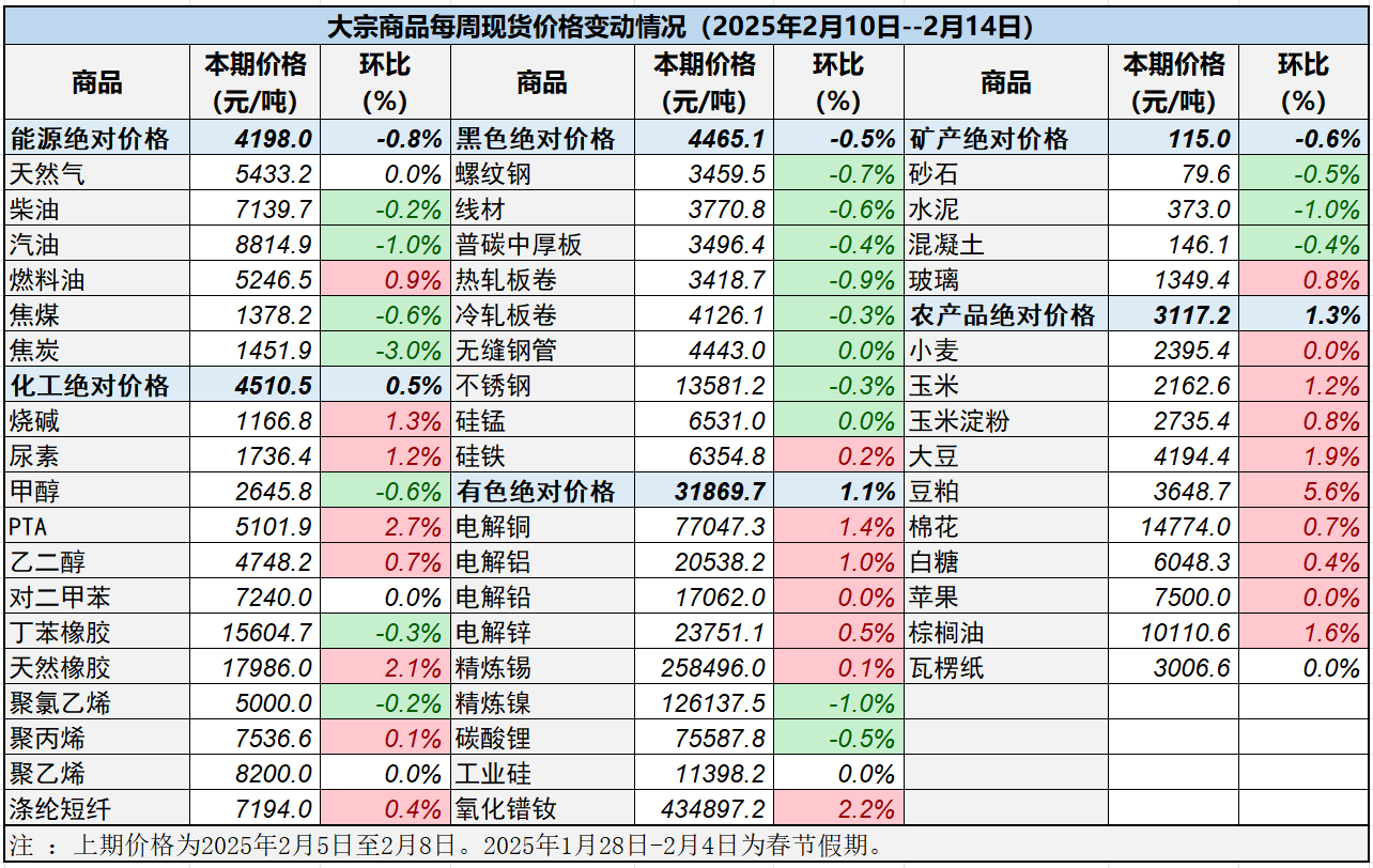 據中國物流與采購聯合會對全國50種重要大宗商品市場價格調查顯示,本期價格(2025年2月10日至2月14日)與上期價格相比,25種(占比50%)價格上漲,20種(占比40%)大宗商品價格下跌,5種(占比10%)價格持平。
