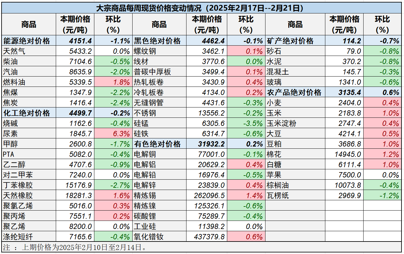 本表所示大宗商品價(jià)格(類別與產(chǎn)品規(guī)格說(shuō)明見(jiàn)附表)為以人民幣計(jì)價(jià)的現(xiàn)貨價(jià)格(包含流通費(fèi)用、利潤(rùn)和稅費(fèi)等)。計(jì)算這些價(jià)格時(shí)使用的信息來(lái)源,主要包括國(guó)內(nèi)重點(diǎn)地區(qū)的生產(chǎn)商、貿(mào)易商及下游消費(fèi)企業(yè)之間的成交、詢報(bào)盤及可成交價(jià)格。價(jià)格單位為人民幣元/噸。