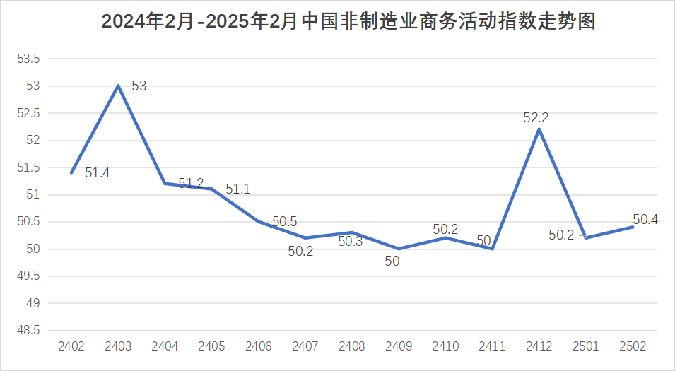 中國物流與采購聯合會、國家統計局服務業調查中心發布的2025年2月份中國非制造業商務活動指數為50.4%,環比上升0.2個百分點。由于非制造業沒有綜合指數,通常以商務活動指數來反映非制造業經濟的總體變化。