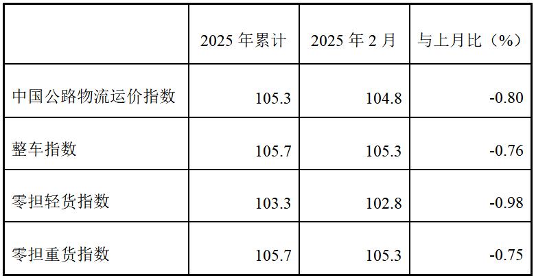 表1 2025年2月中國公路物流運價指數表