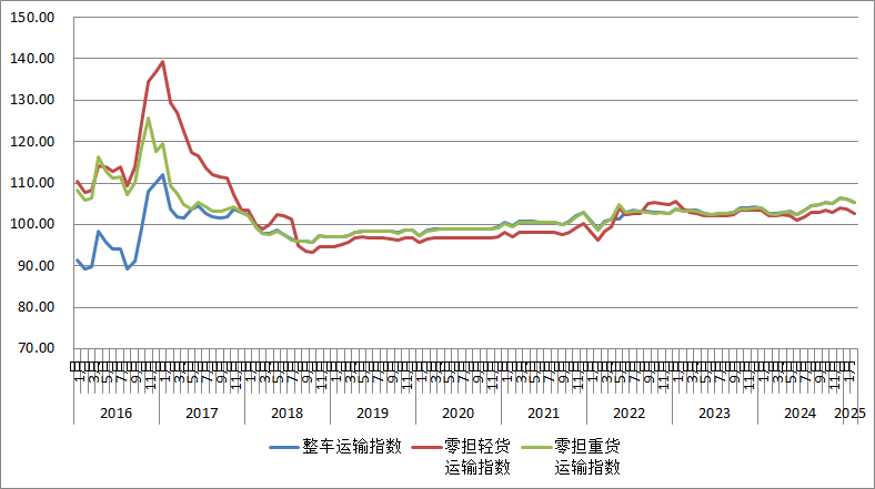 分車型指數看,各車型指數環比有所回落,同比去年保持增長。以大宗商品及區域運輸為主的整車指數為105.3點,比上月回落0.76%,比上年同期回升2.55%。零擔指數中,零擔輕貨指數為102.8點,比上月回落0.98%,比上年同期回升0.66%;零擔重貨指數為105.3點,比上月回落0.75%,比上年同期回升2.64%。